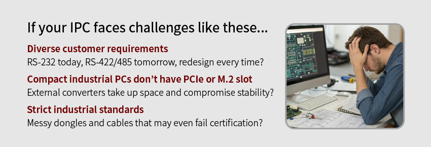 No PCIe / M.2 slot requiredDirectly connects to the motherboard’s RS-232 header |